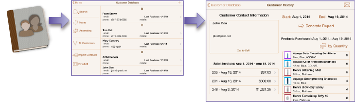 The customer database allows you to enter your customers manually or import them from your iPad's Contacts app. Select a customer to view the contact information, access to their previous sales invoices and a summary of products that they have purchased. Products are sorted by quantity or date of purchase. The sales invoices and product purchase history are shown for the dates that you select.
