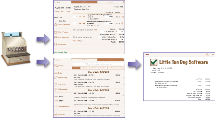 1. New sales - This section is used to enter sales transactions. It is up to you whether or not On Shelf totals the sales transactions. Once you confirm a sale, On Shelf automatically updates the product's sales history. If you elect to have On Shelf calculate your sales totals, then you can print or email an invoice when you confirm the sale. Products can be added to the sale using the barcode reader or by selecting them from a list. You can search for product by brand, product name or an internal product designator. You can also add a customer to the sales invoice.
